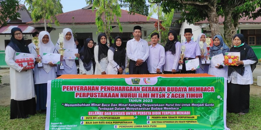 Idi-MTsN 2 Aceh Timur [13/03/2023] --- Perpustakaan Nurul Ilmi Madrasah Tsanawiyah Negeri (MTsN) 2 Aceh Timur menyerahkan piagam penghargaan kepada peserta lomba baca puisi antar kelas dan peserta didik yang terpilih sebagai duta, raja dan ratu baca perpustakaan serta peserta didik dan guru tenaga kependidikan (GTK) teraktif perpustakaan di lapangan utama MTsN 2 Aceh Timur, Senin (13/03/23).
