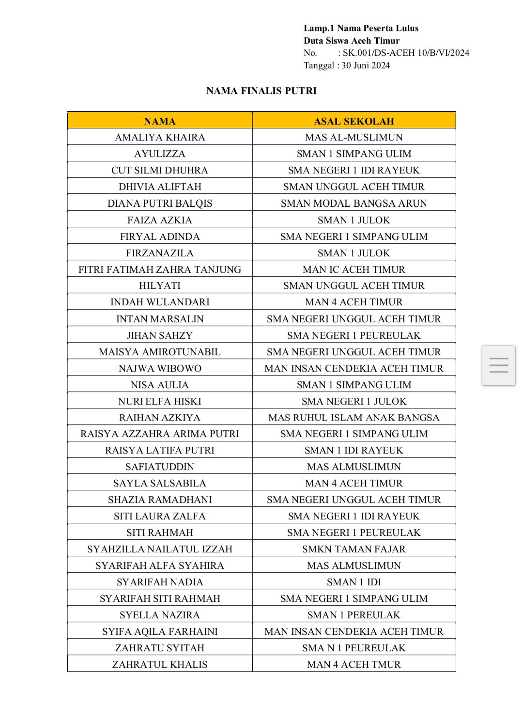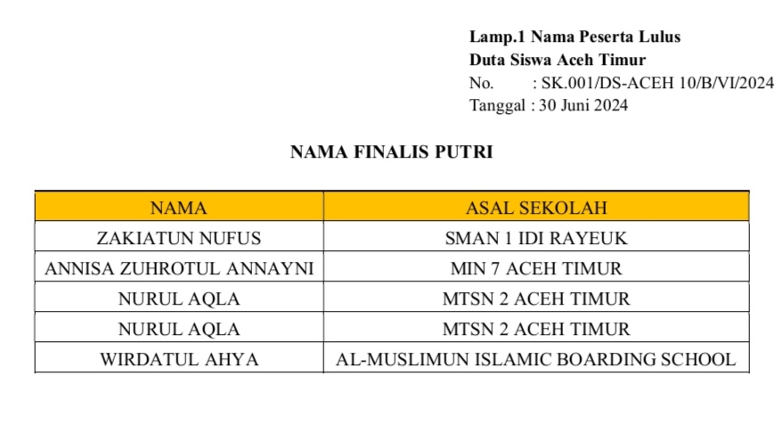 Tertulis dari surat edaran dari Lembaga Duta Siswa Kabupaten Aceh Timur (Yayasan Duta Siswa Indonesia) dengan Nomor: SK.001/ DS-ACEH 10/b/VI/2024 Tanggal 30 Juni 2024 yang ditandatangani oleh Pj. Duta Siswa Kabupaten Aceh Timur dan National Director Duta Siswa Indonesia, terpilihlah 13 finalis putra dan 38 finalis putri serta 1 finalis cadangan putri yang harus mengikuti pembukaan karantina online, materi-materi online, dan finalis diwajibkan membuat vidio profil diri dan ide program kerja untuk menentukan Duta Siswa Utama dan dukungan melalui instagram untuk menentukan gelar Duta Siswa Favorite terhitung mulai 14 Juli s.d 4 Agustus 2024 sesuai dengan prosedur dan mekanisme yang telah ditentukan.