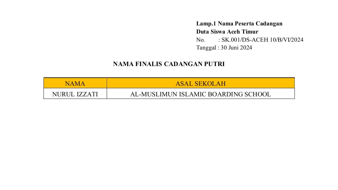 MTsN 2 Aceh Timur [2/7/2024] --- Peserta didik sekaligus ketua OSIM MTsN 2 Aceh Timur, Nurul Aqla, terpilih sebagai Finalis Duta Siswa Kabupaten Aceh Timur dalam ajang pemilihan Duta Siswa Kabupaten Aceh Timur Tahun 2024 yang di selenggarakan oleh Lembaga Duta Siswa Kabupaten Aceh Timur bekerjasama dengan Duta Siswa Indonesia.